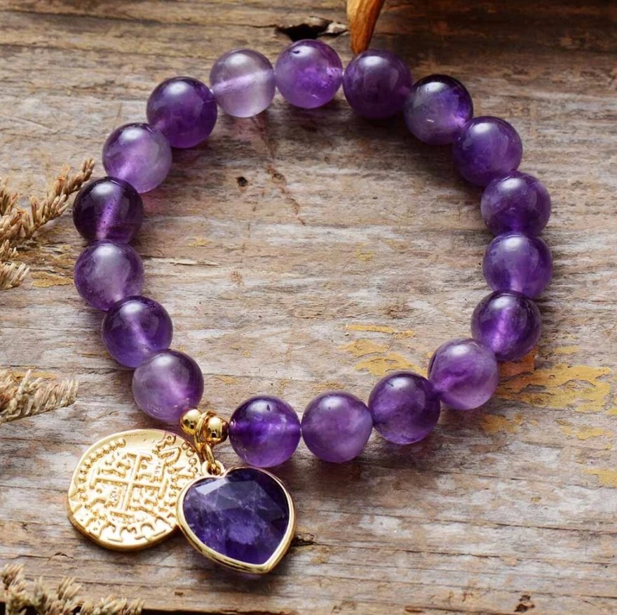 Il braccialetto "Amethyst Love Charm" è composto da una combinazione di potenti pietre curative ed è l'accessorio perfetto per gli amanti della moda e gli spiriti liberi. Indossalo e ti sentirai positivo e incoraggiato. È realizzato al 100% a mano e si adatta comodamente a qualsiasi polso.