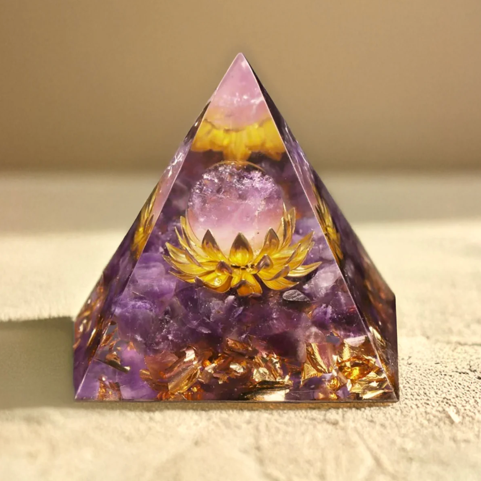 La piramide è realizzata con materiali pregiati come rame , oro , resina e un bellissimo ametista al centro. Questa combinazione garantisce un forte effetto energetico che migliora il tuo benessere e innalza la tua vibrazione.