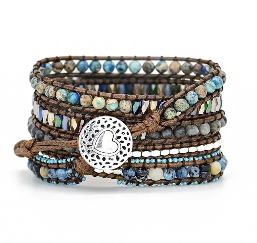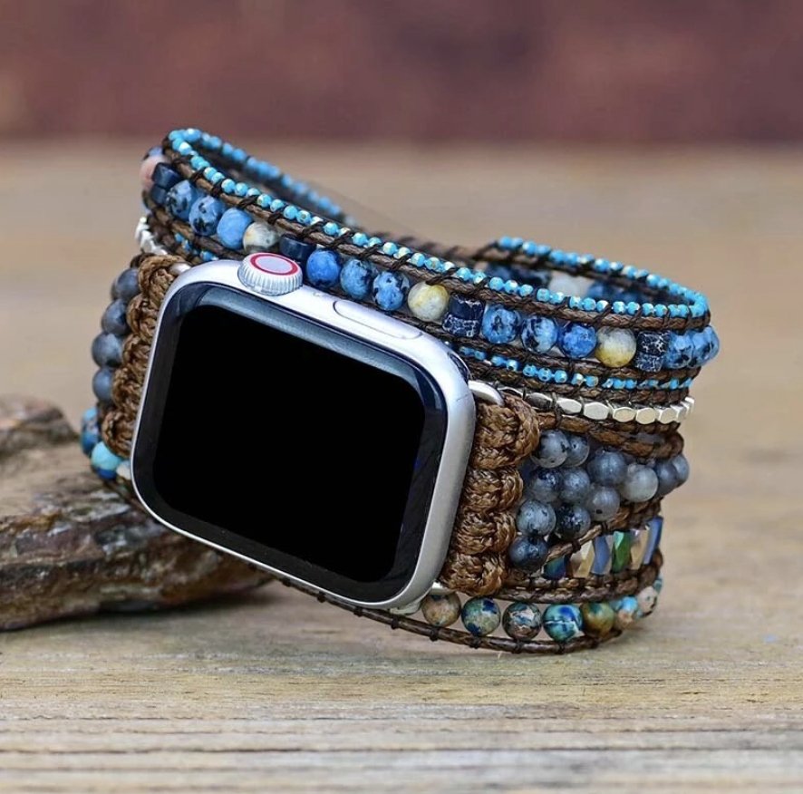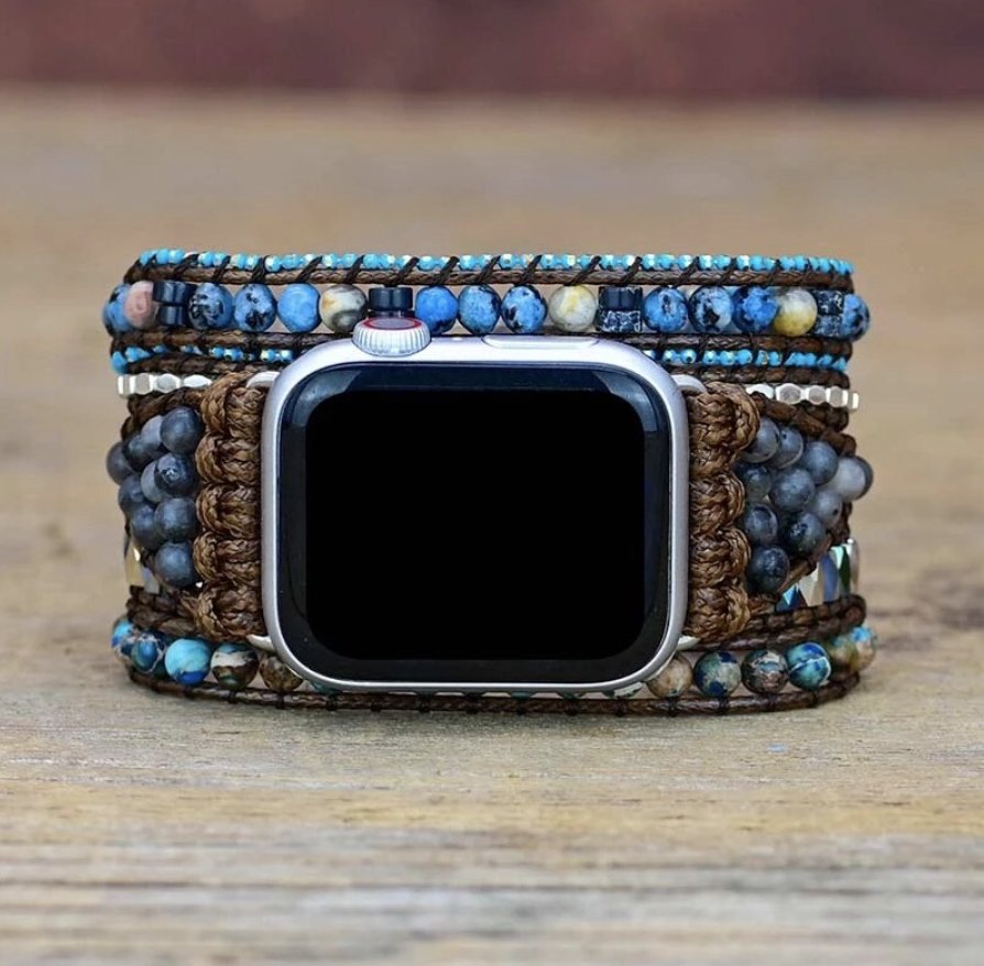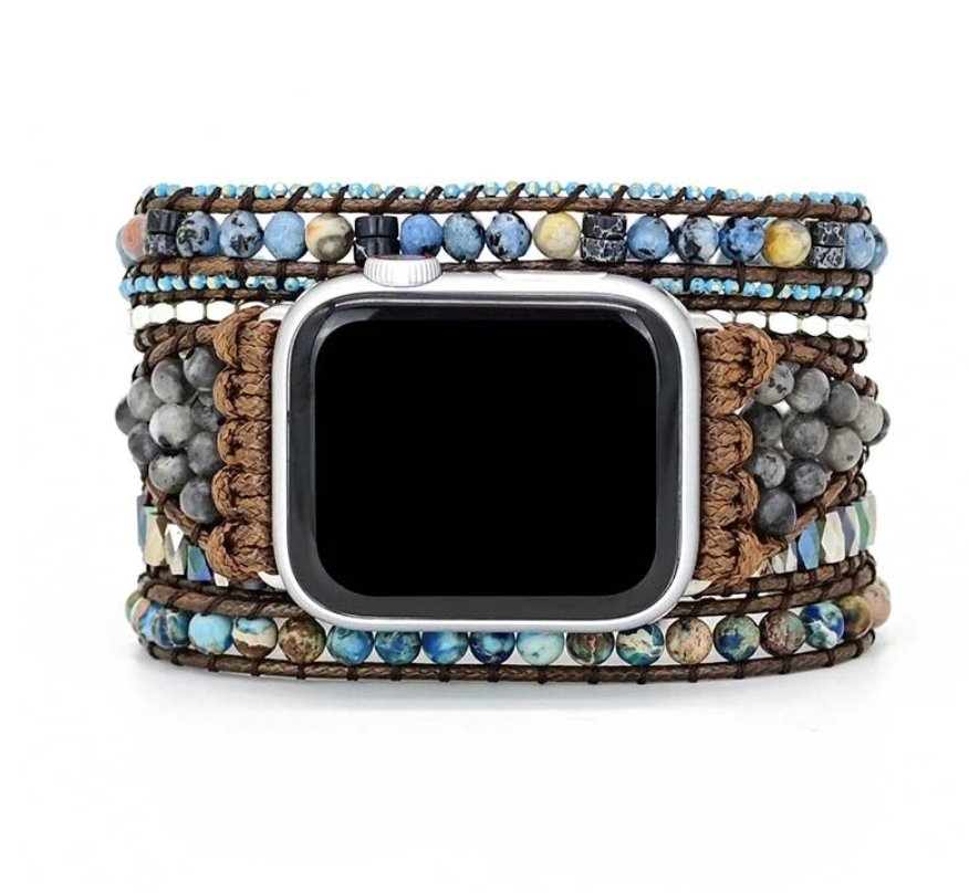 Il braccialetto è realizzato con pietre preziose naturali di alta qualità, come il diaspro e il lapislazzuli, pelle e lega di zinco, e grazie alla sua struttura elastica si adatta facilmente al tuo polso. Con il suo raffinato design avvolgente, il tuo Apple Watch diventa un accessorio di stile, aggiungendo un tocco di moda che conquisterà tutti.