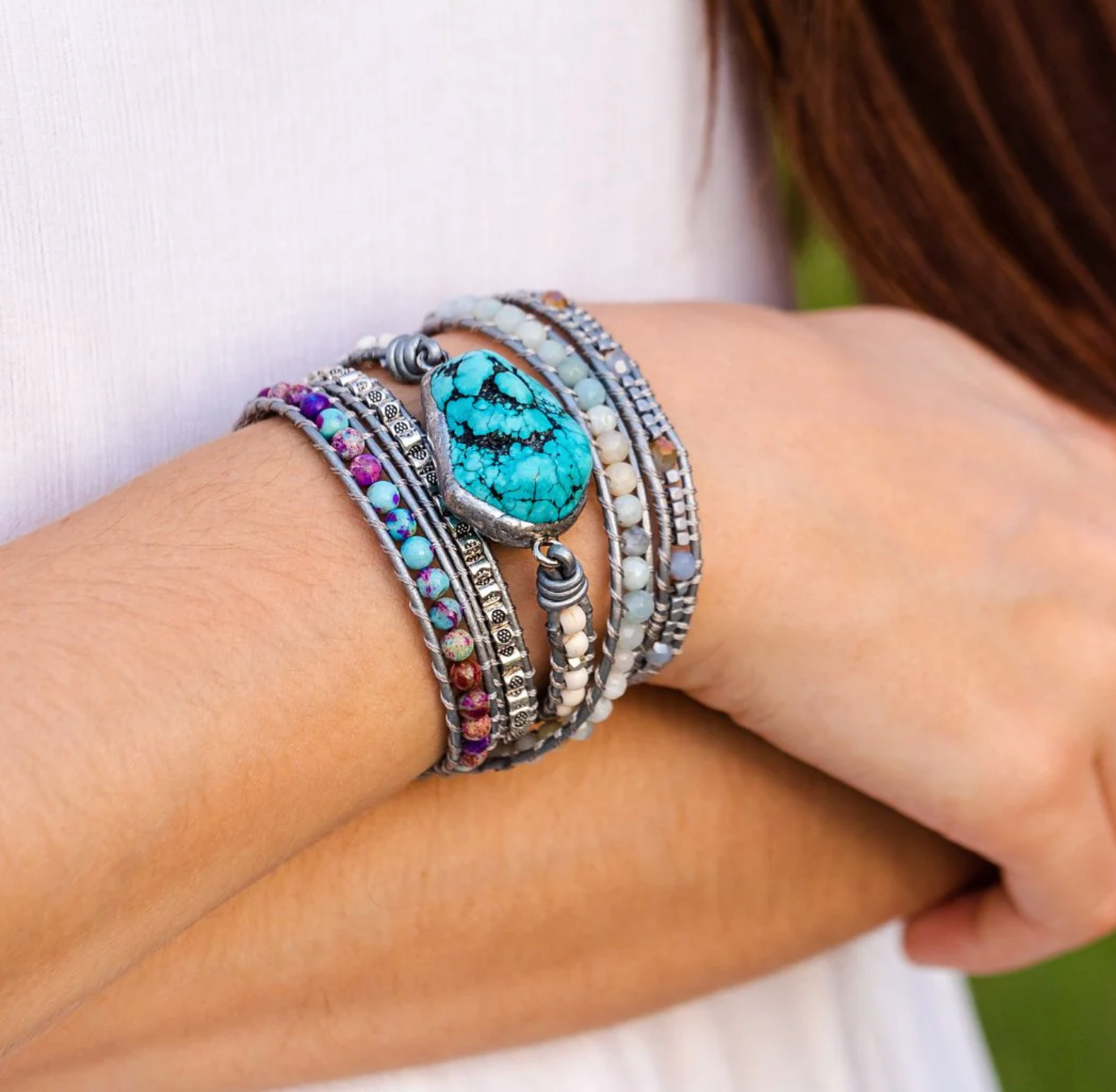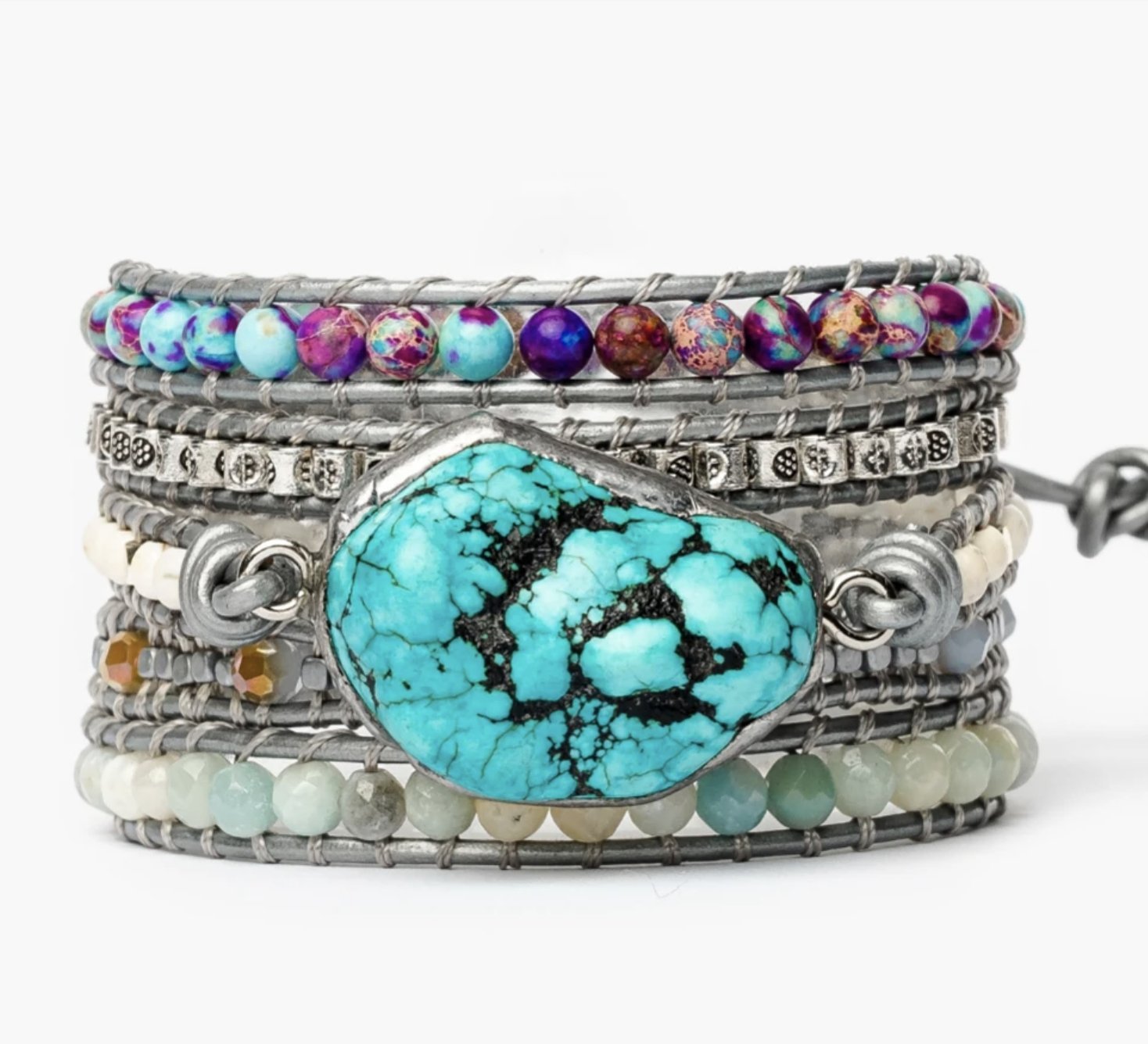 Indossa questo elegante braccialetto avvolgente in diaspro per sperimentare armonia, forza ed equilibrio – un vero gioiello boho per il tuo polso.