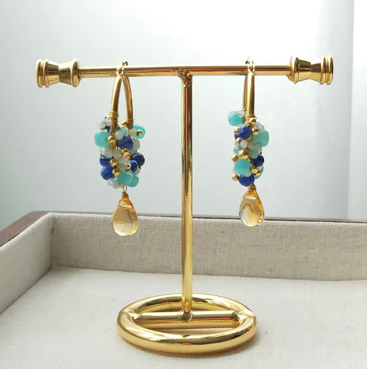 Orecchini di lusso in amazzonite, lapislazzuli e citrino – Realizzati a mano con pietre preziose naturali e argento 925 placcato oro.