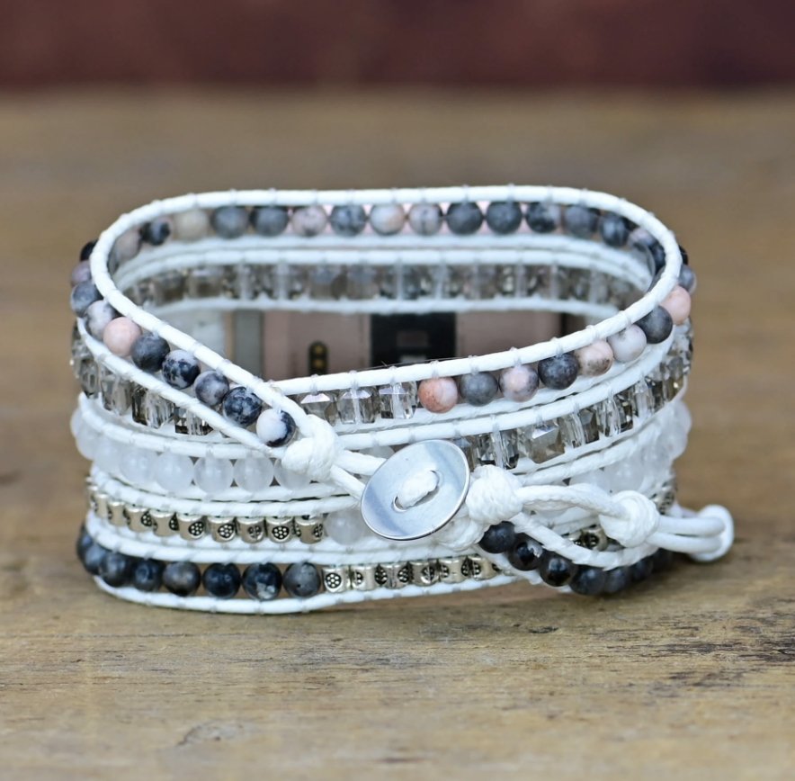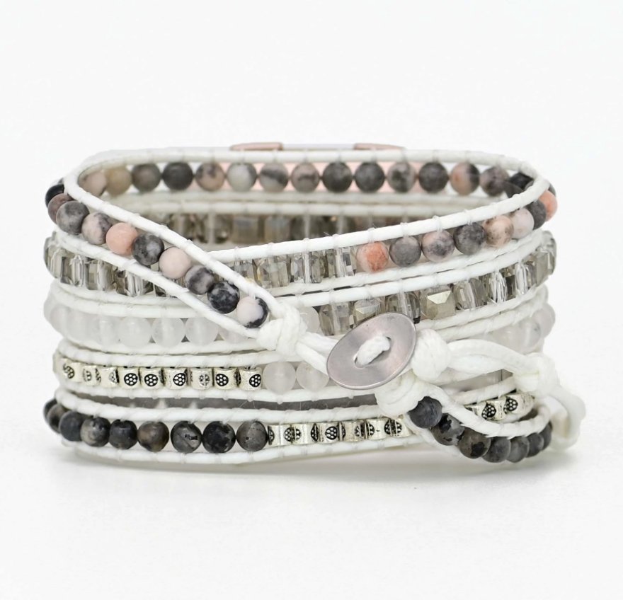 Materiale: Rhodonite naturale, quarzo, pietre preziose di labradorite, vera pelle, lega di zinco.