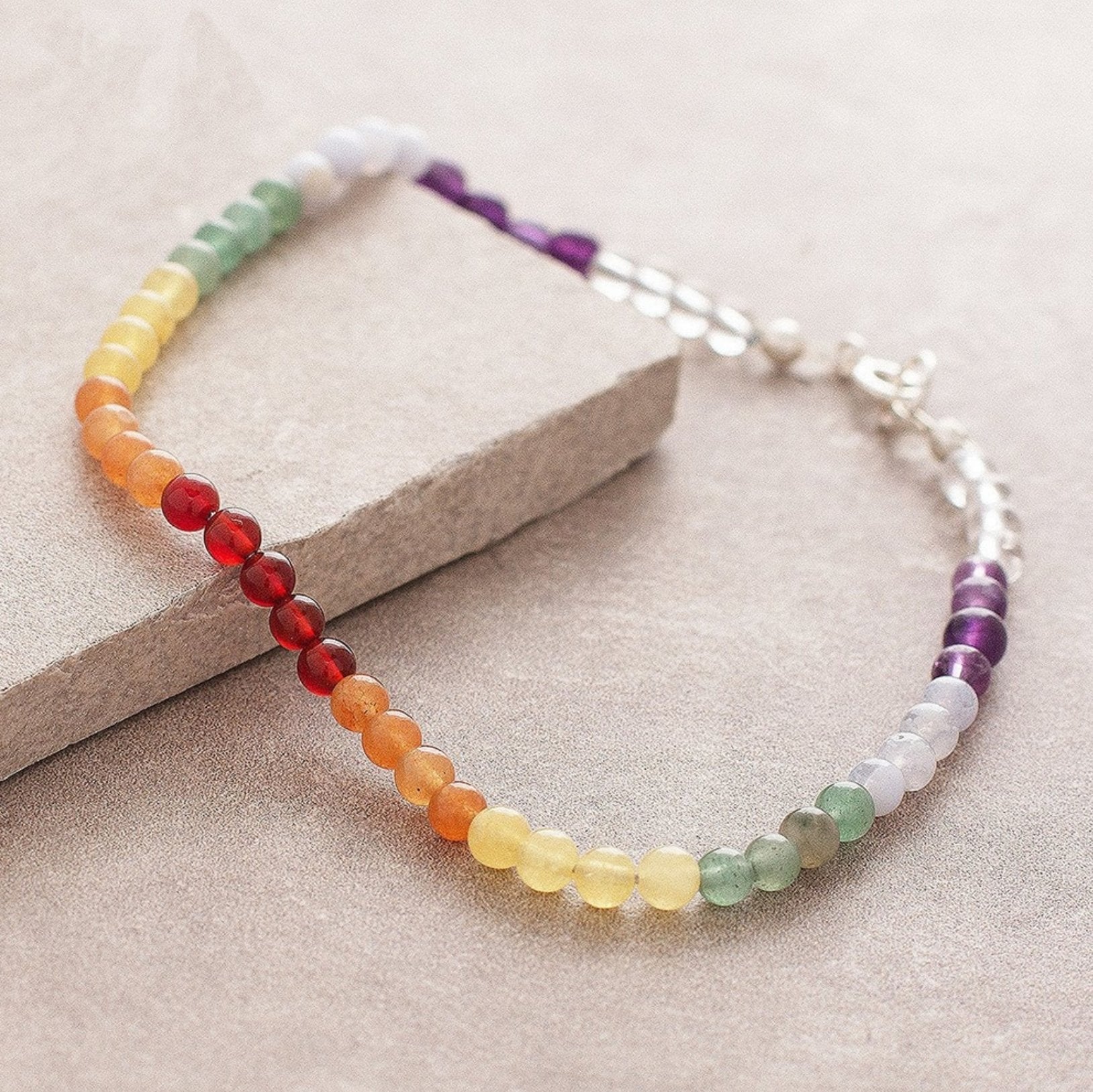 Die 7 Chakra - Fusskette aus echten Edelsteinen ist ein besonderes Schmuckstück, das dich im Alltag begleitet und deinen Sommer-Look mit Farbe und Leichtigkeit verschönert. Mit ihrer frischen Optik leuchtet die 7 Chakra Fusskette hell in der Sonne und verleiht deinem Stil eine sommerliche sowie feine Note.