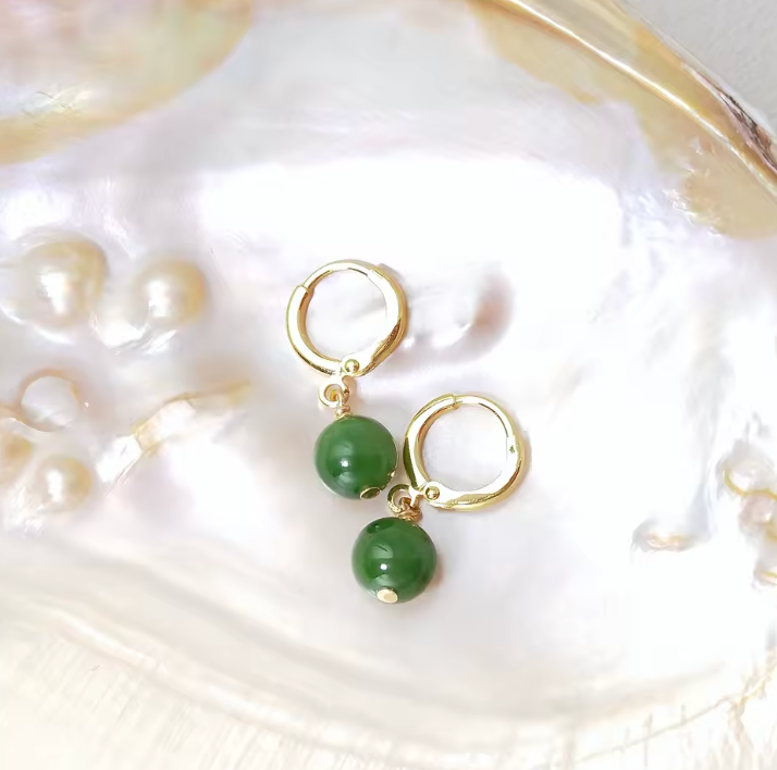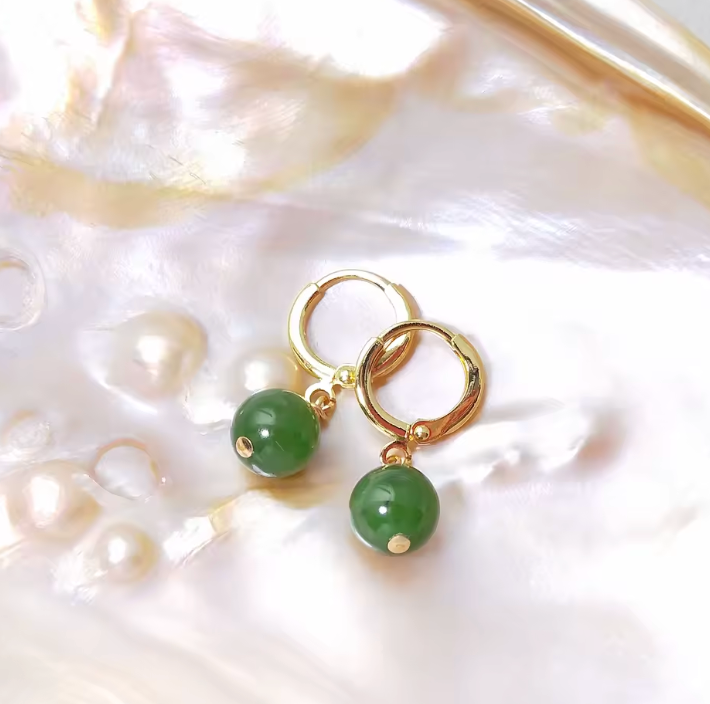 Questi eleganti orecchini uniscono un design minimalista a un profondo significato simbolico. Al centro di ogni orecchino si trova una pietra di giada di alta qualità (qualità AA) con un diametro di circa 8 mm, incastonata in delicati elementi placcati oro 14 carati.