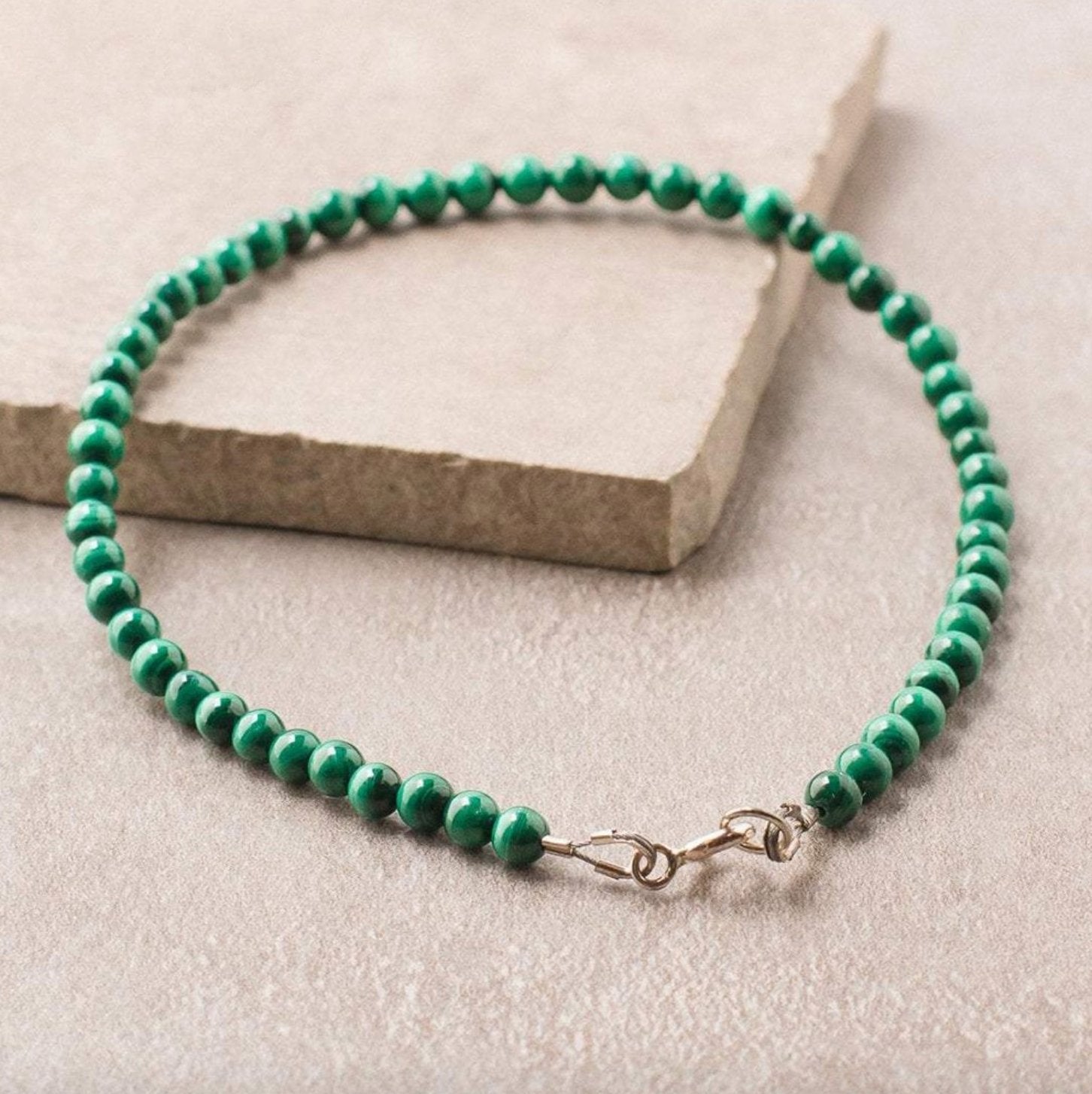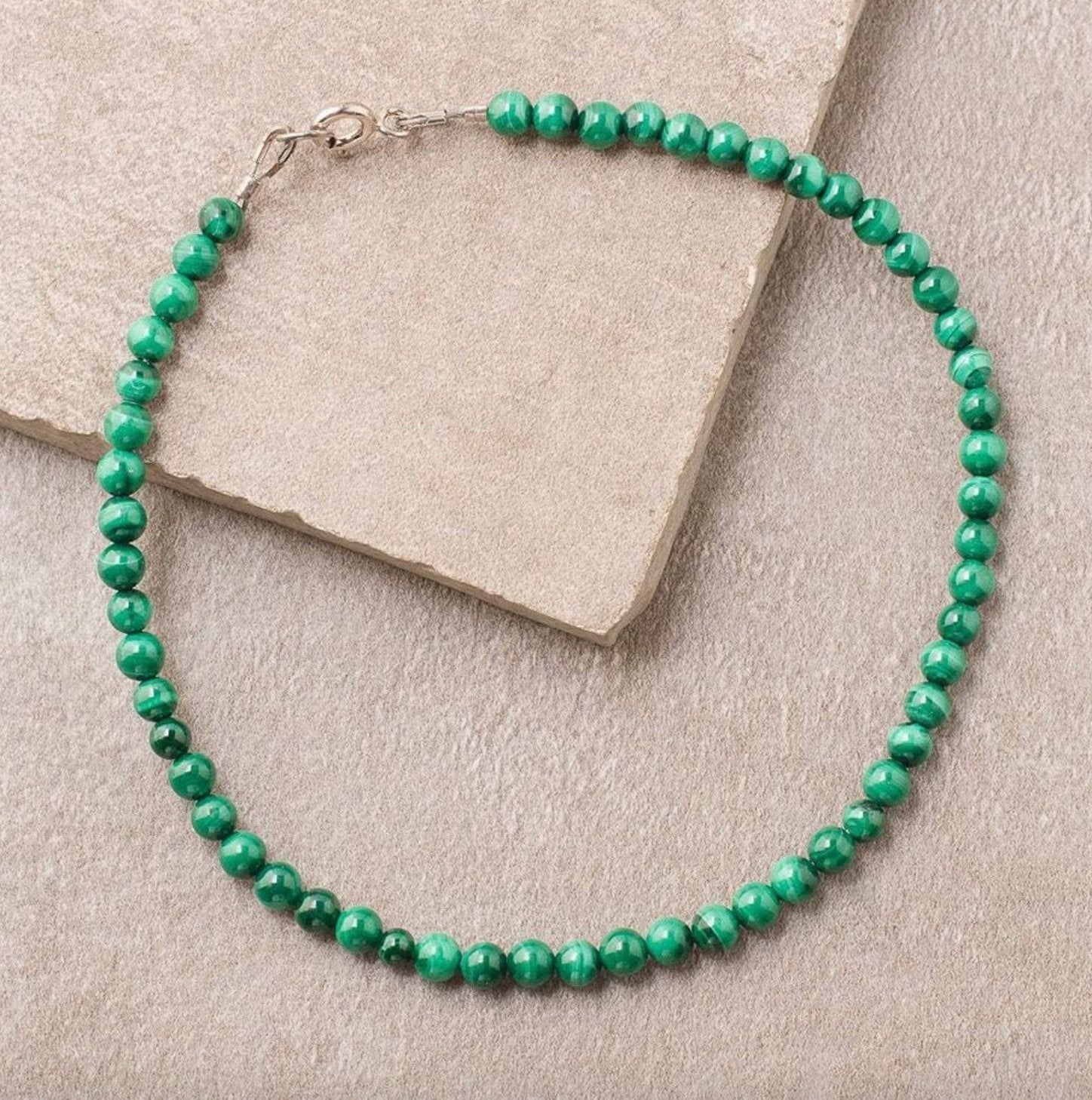 La cavigliera Green Malachite , realizzata con perle di malachite naturale, è un gioiello speciale che ti accompagnerà nella vita quotidiana, arricchendo il tuo look estivo con freschezza ed energia. Con il suo intenso verde, la cavigliera Green Malachite risplende al sole, donando al tuo stile un tocco vivace ed elegante.