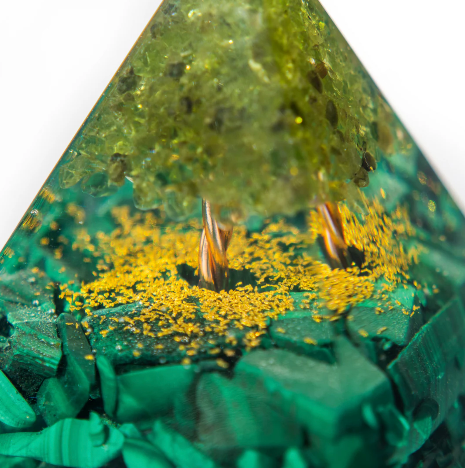 La nostra piramide di orgonite con albero della vita in malachite unisce materiali potenti come peridoto, malachite, rame e resina in un oggetto unico che favorisce la tua energia e il tuo benessere. Ha un effetto sia estetico che curativo.