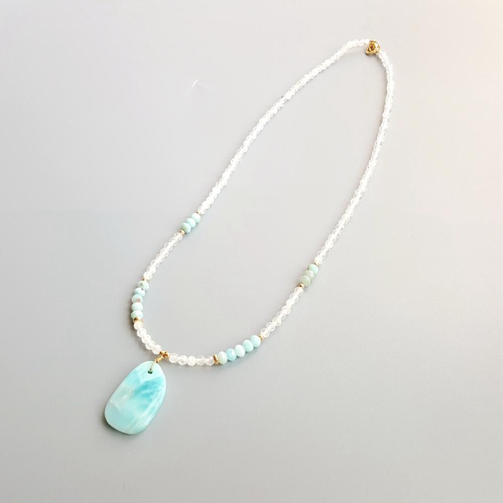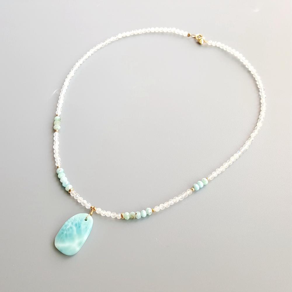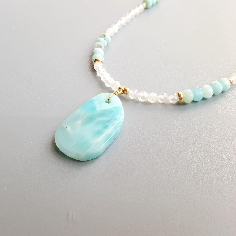 ✥ Natürlicher Larimar-Anhänger, kombiniert mit Mondsteinen und hochwertigem Echt-Silber