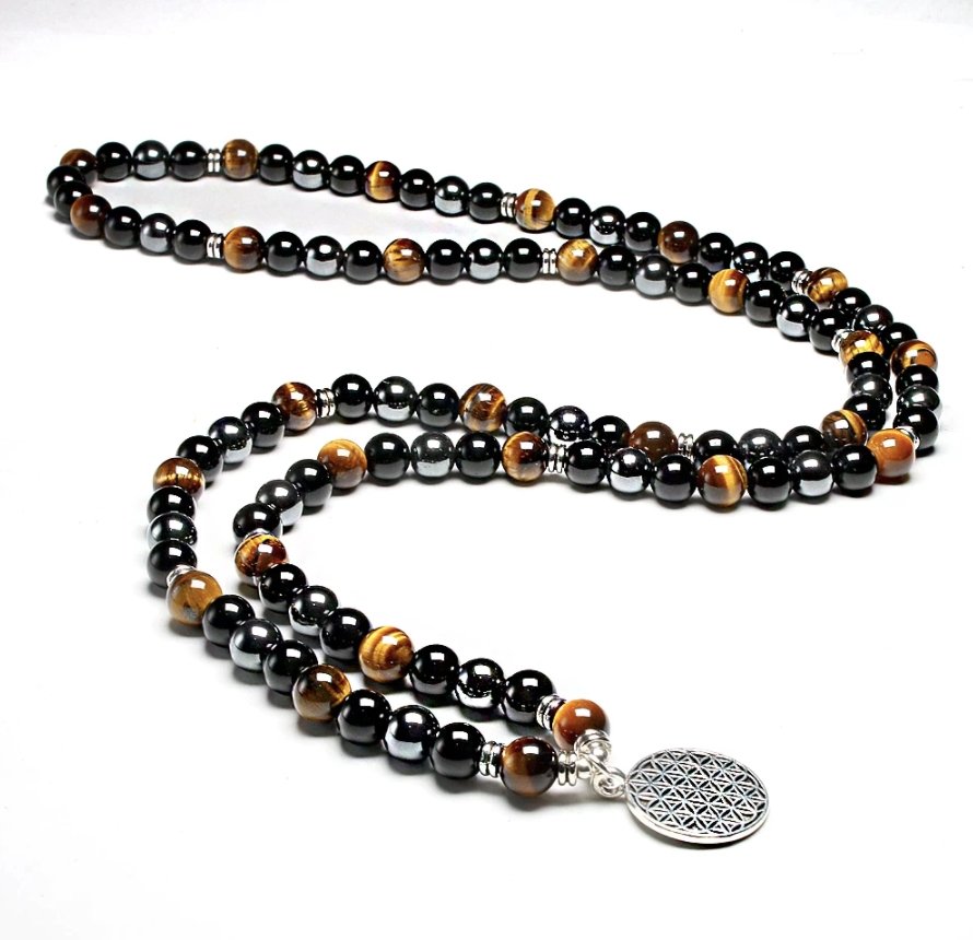 Collana Mala con Fiore della Vita e Occhio di Tigre – Forza, Protezione e Concentrazione