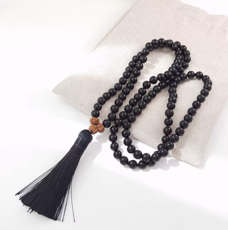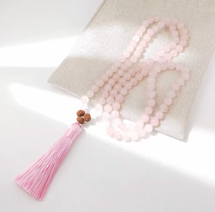 ✦ Perle di alta qualità AA in acquamarina, quarzo rosa o onice, semi di Rudraksha naturali, nappina artigianale in cotone.