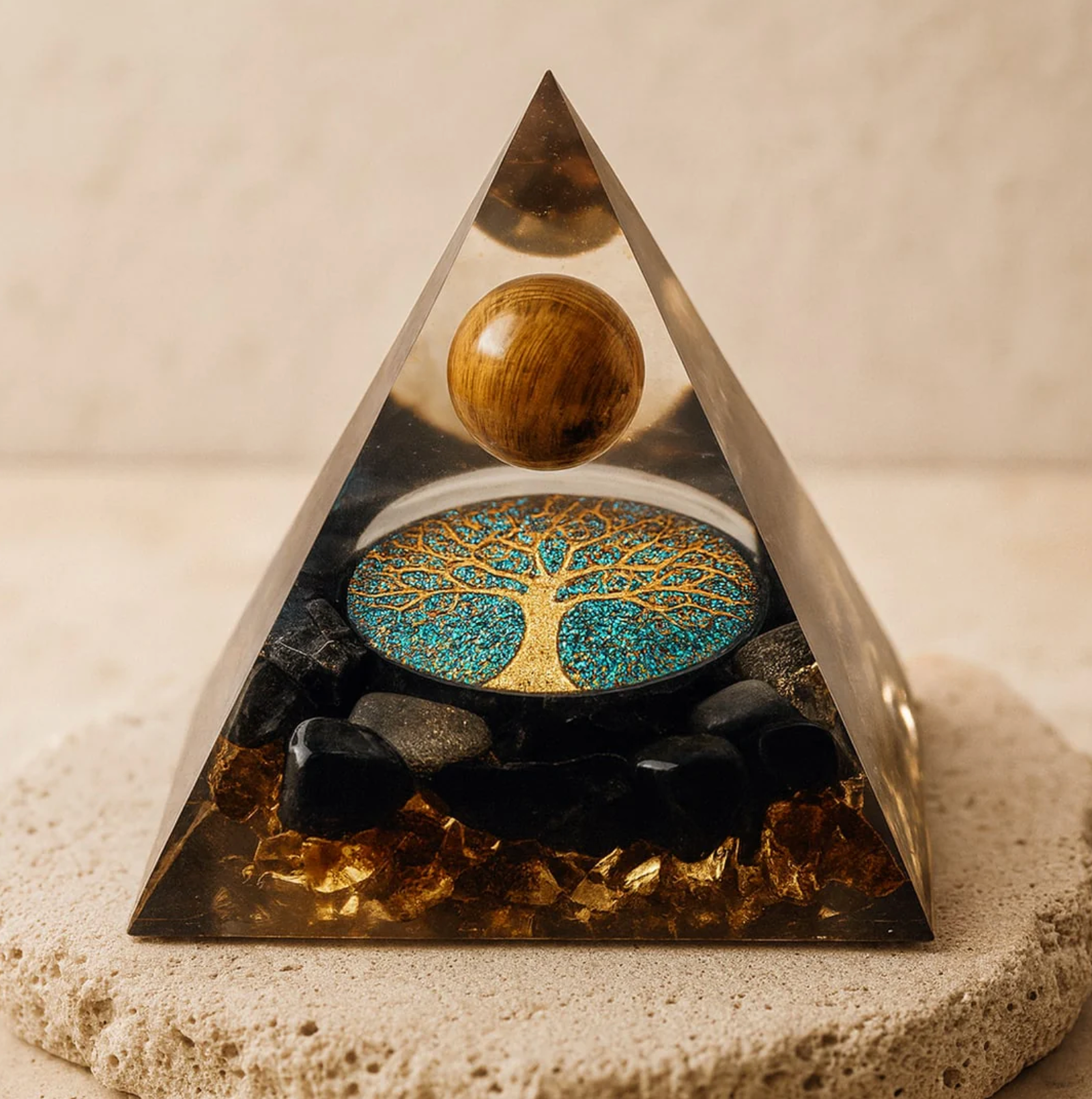 Piramide di orgonite con albero della vita e occhio di tigre