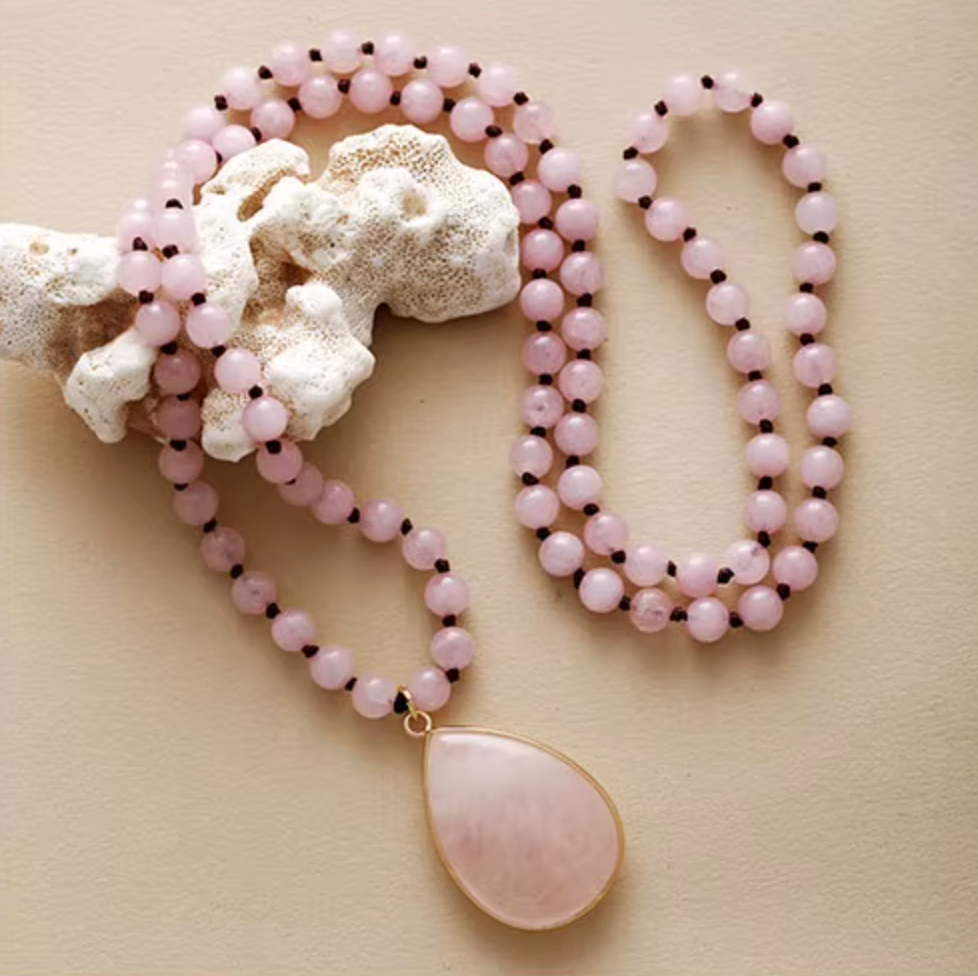 Wir bieten Rosenquarz-Armbänder, Mala-Ketten, Halsketten und Ringe – jedes Stück handgefertigt!