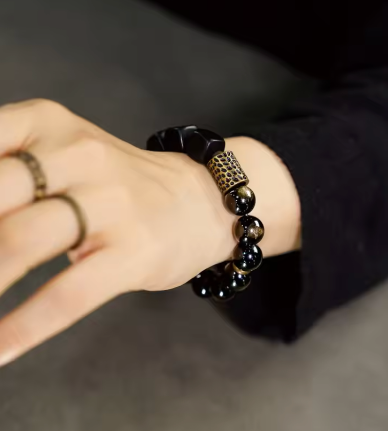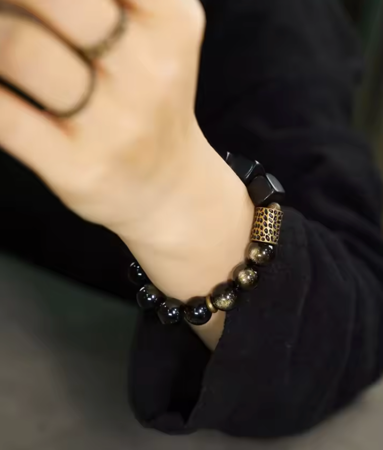 I raffinati dettagli in ottone non solo conferiscono a questo braccialetto un tocco di lusso, ma simboleggiano anche resistenza e forza. L'ottone amplifica le energie positive dell'ossidiana e dell'ebano, favorendo l'armoniosa interazione di questi potenti materiali.