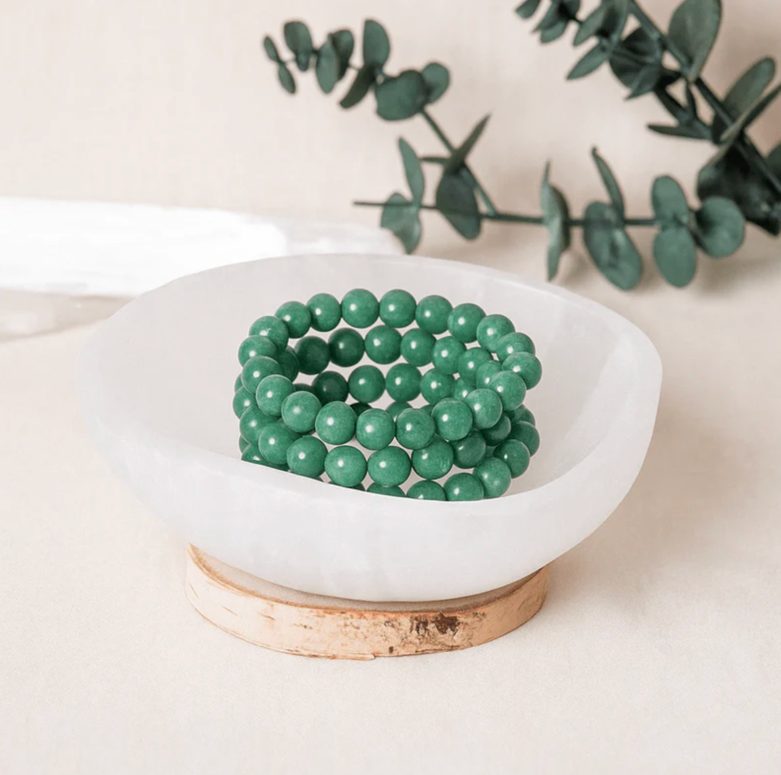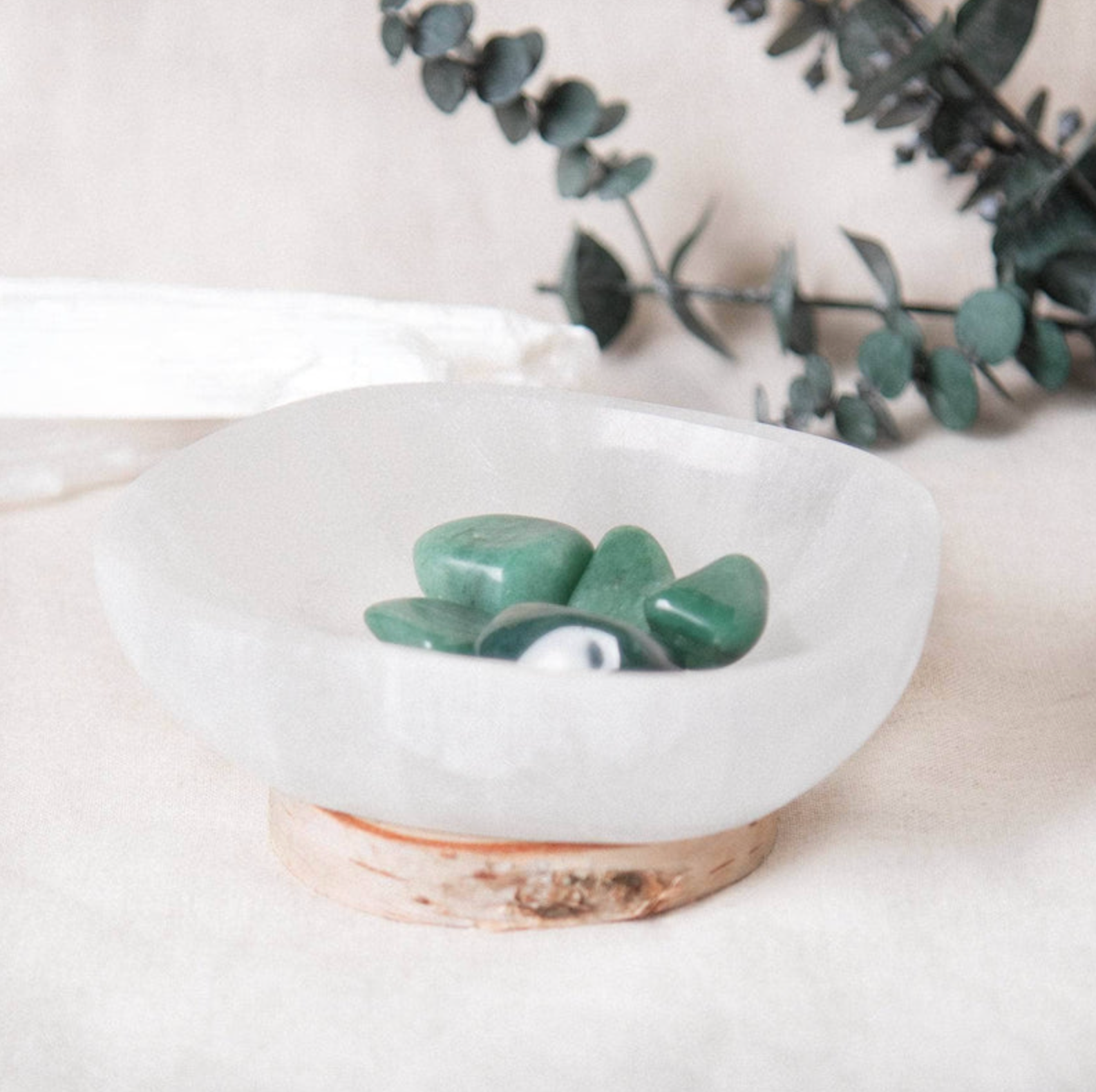 Selenit wird auch der „Lichtstein“ genannt. Seine sanft schimmernde, milchig-weiße Oberfläche erinnert an Mondlicht und bringt Frieden, Klarheit und Schutz in dein Zuhause.