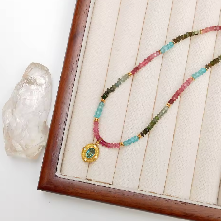 Questa collana unica, realizzata con una pregiata placcatura in oro giallo 750, brilla di colori arcobaleno. È impreziosita da pietre preziose di diversi colori, incastonate a mano. Le pietre, tagliate a principessa e ottagonali, fanno risplendere l'esclusivo ciondolo.